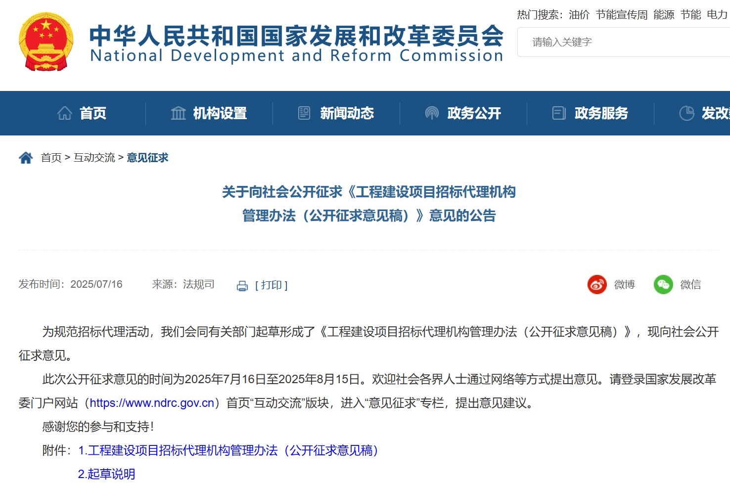 為規(guī)范招標(biāo)代理活動(dòng),國(guó)家發(fā)展和改革委員會(huì)會(huì)同有關(guān)部門起草形成了《工程建設(shè)項(xiàng)目招標(biāo)代理機(jī)構(gòu)管理辦法(公開征求意見(jiàn)稿)》,現(xiàn)向社會(huì)公開征求意見(jiàn)。此次公開征求意見(jiàn)的時(shí)間為2025年7月16日至2025年8月15日。